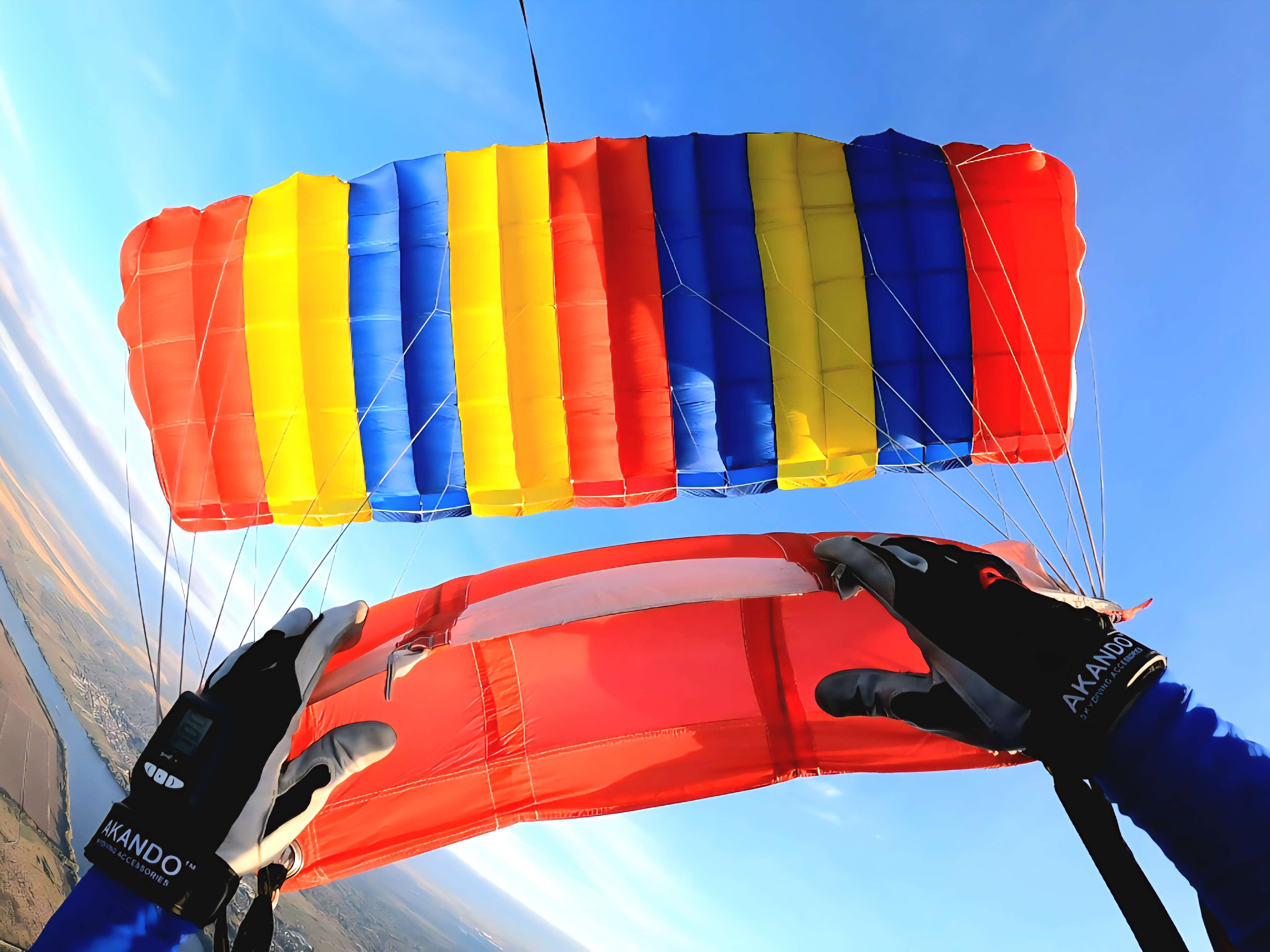 Яркий 9-ти секционный переходной купол в отличном состоянии. На куполе около 400 прыжков, ткань без повреждений, поменяны стропы управления. DOM 02.2010